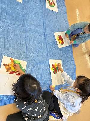 拾った落ち葉をペタペタと貼っていきます。